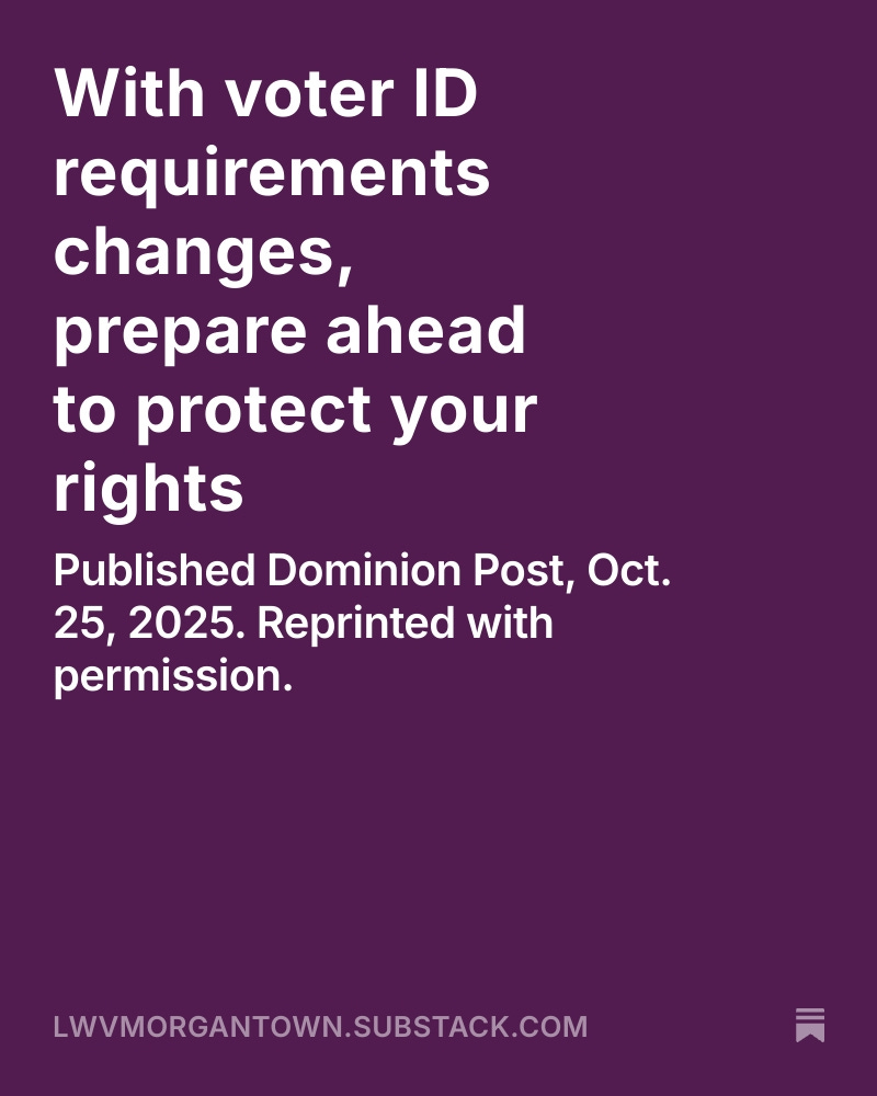 Check out our new post! Do you know that our Legislature changed voter ID requirements this year? Be aware, prepare now for 2026 elections, West Virginia. https://lwvmorgantown.substack.com/p/with-voter-id-requirements-changes